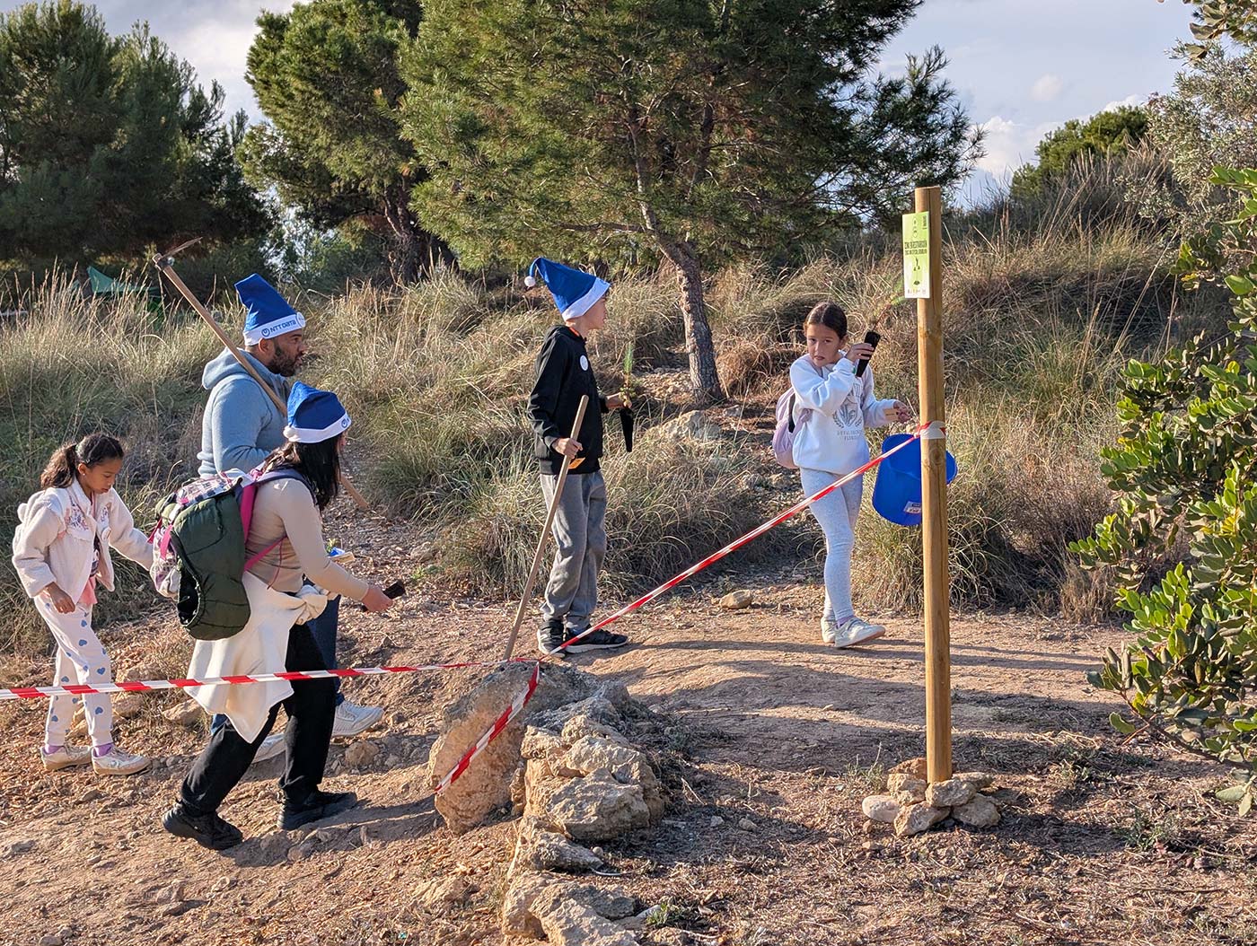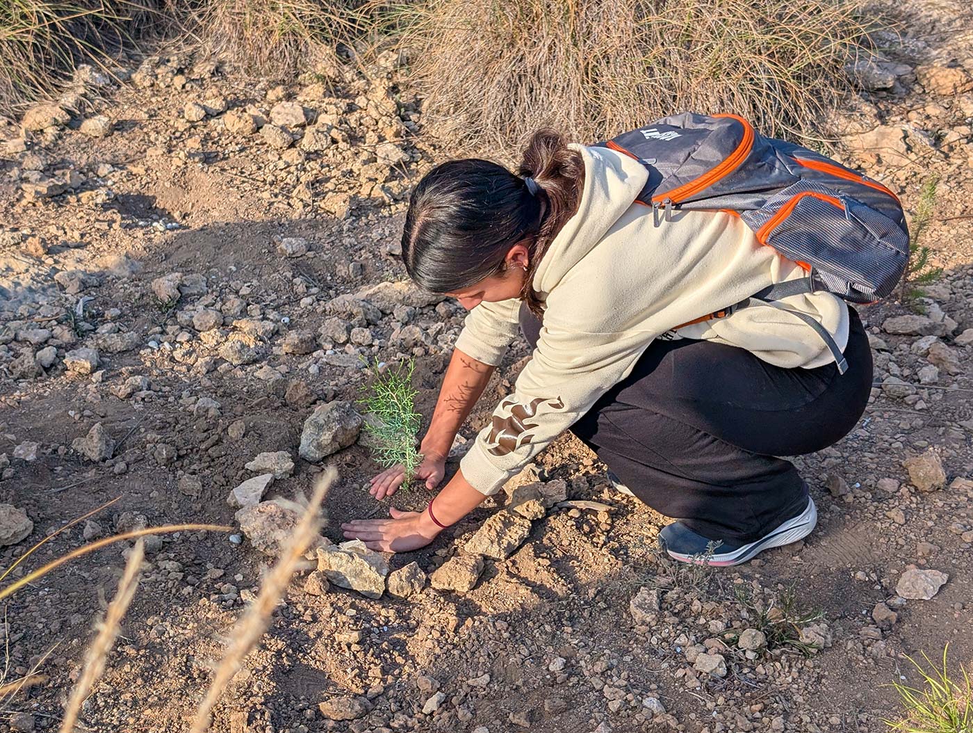 Durante la jornada se llevó a cabo la plantación de especies autóctonas adaptadas al entorno mediterráneo, entre ellas Ephedra fragilis, Rosmarinus officinalis, Tetraclinis articulata y Pinus pinea, junto con la siembra de aproximadamente mil semillas de especies herbáceas autóctonas. La actuación contempla además la instalación de un sistema de riego por goteo alimentado con agua reciclada, lo que permite asegurar el establecimiento inicial de la vegetación plantada optimizando el uso del recurso hídrico y reduciendo de forma significativa el consumo de agua potable. Esta intervención contribuye de manera directa a la estabilización del suelo, la reducción de procesos erosivos y la mejora de la estructura edáfica, favoreciendo además la creación de microhábitats para insectos polinizadores, aves y pequeña fauna. A medio y largo plazo, estas actuaciones permiten incrementar la captación de carbono atmosférico, reducir el riesgo de incendios forestales y mejorar la capacidad de autorregeneración del ecosistema en una zona especialmente sensible del término municipal de Alicante.